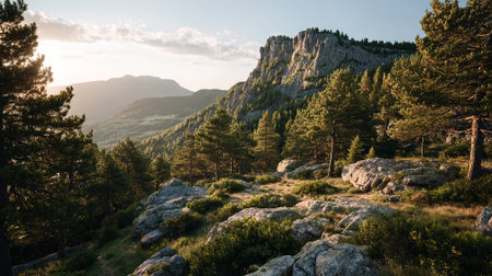 Sunset in a mountainous landscape, with a wide forest of trees.