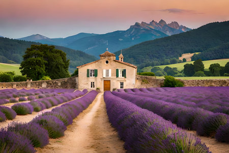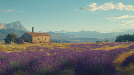A tranquil lavender field stretches beneath a clear blue sky, featuring a rustic cottage amidst a stunning mountain landscape, perfect for nature lovers.