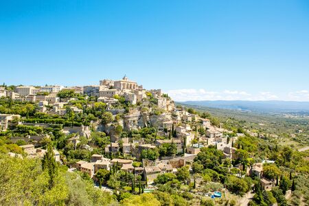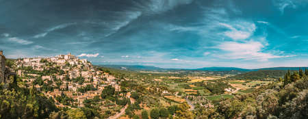 Gordes, Provence, France. Beautiful Scenic View Of Medieval Hilltop Village Of Gordes. Sunny Summer Sky. Famous Landmark. panorama scenic view