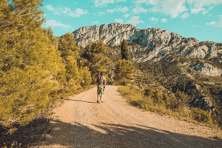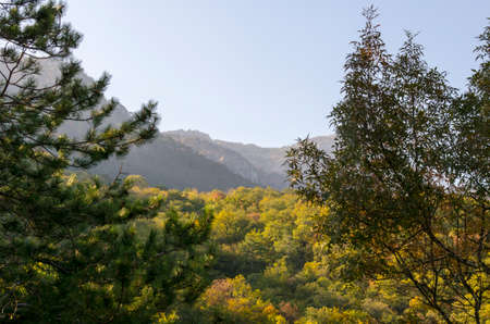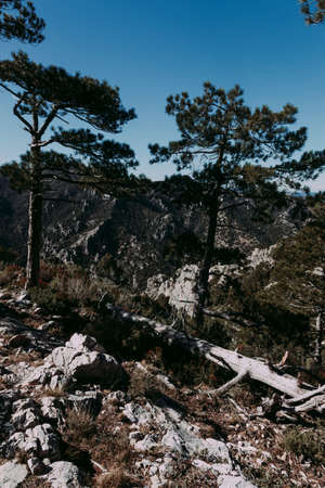 Mountain landscape with pine trees and blue sky with clouds in Spain