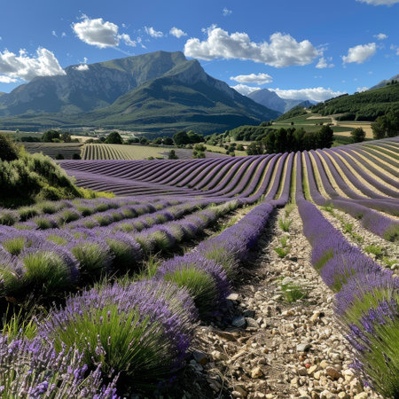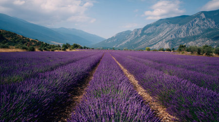 Rows of vibrant lavender stretch across the landscape, with majestic mountains in the background under a blue sky filled with clouds. The scene captures the beauty of nature.