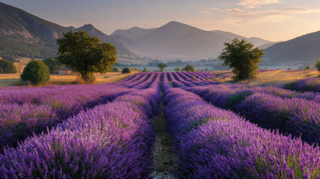 Breathtaking lavender fields stretch across the landscape, illuminated by soft morning light, with mountains in the background, creating a tranquil and serene atmosphere.