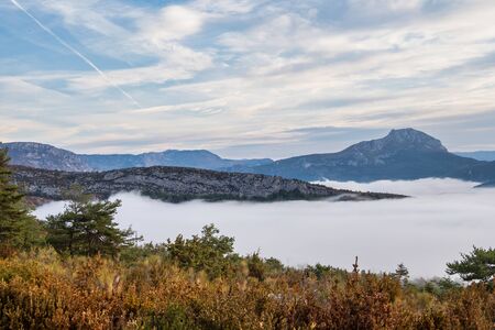 Morning mist hanging over Verdon Gorge, Gorges du Verdon, amazing landscape of the famous canyon with winding turquoise-green colour river and high limestone rocks in French Alps, Provence, France