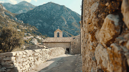 Serene Village Street in an Italian Mountain Town, Capturing Peaceful Morning Atmosphere and Rustic Architecture. Ash Wednesday. Copy Space.