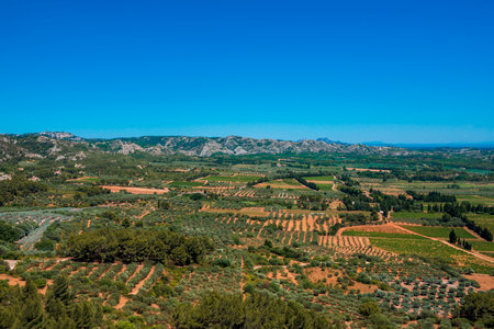 Scenic amazing view from one of the most beautiful villages of France Gordes of Luberon valley in Provence, France. Sunny day and blue sky above green hills and vineyards. Rural provencal landscape.