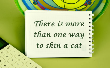 There is more than one way to skin a cat text on a notepad on the background of a clock next to a calculator
