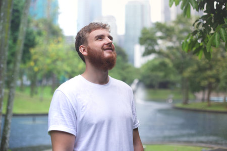 Caucasian male with beard looks up thoughtfully under blue sky