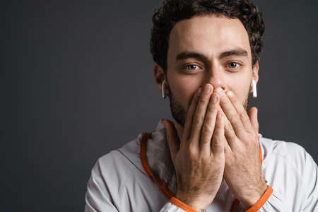 Unshaven surprised guy in wireless earphones covering his mouth isolated over grey background