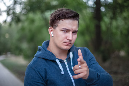 Hey you. Close up portrait of serious young caucasian man pointing finger at you. Park ourdoors background. Attractive man, white earphones, silver ring on the finger, dark hair, casual blue sportswear, smart look. Strong emotions, copy space.