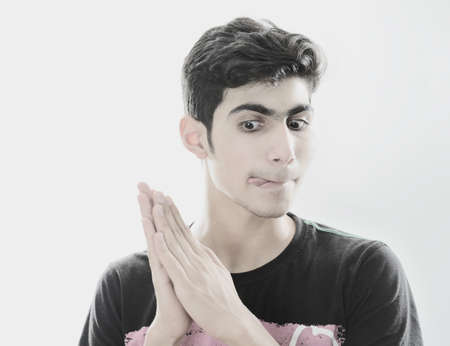 Portrait of young Indian man against gray background