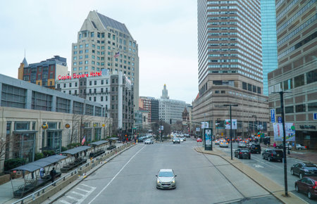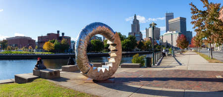 Providence, Rhode Island, United States - October 25, 2018: Panoramic view of a beautiful modern downtown city during a vibrant sunny day.