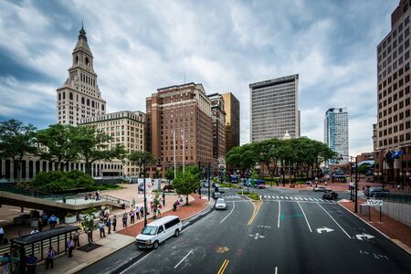 Pearl Street and buildings in downtown Hartford, Connecticut.