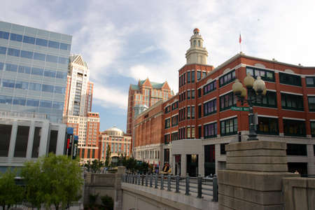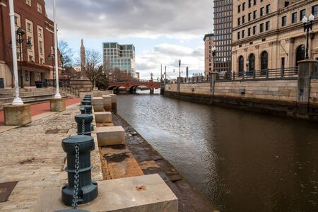 Downtown city view over the Woonasquatucket River canal in Providence Rhode Island USA