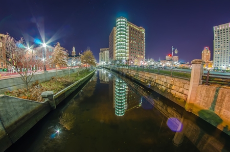 Buildings in downtown and the Providence River at night, in Providence, Rhode Island.