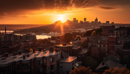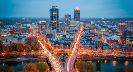 Providence, Rhode Island, United States. Panoramic view of a modern downtown city skyline on the Atlantic Ocean East Coast. Colorful Sunset Sky Art Render.