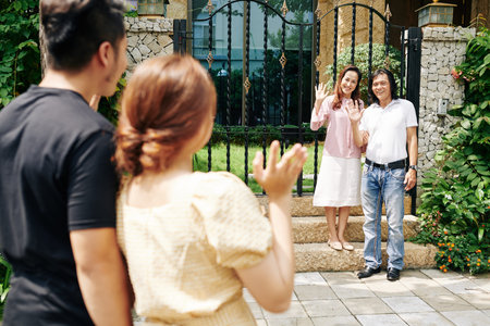 Happy mature Vietnamese couple meeting their adult children at entrance gate of their house