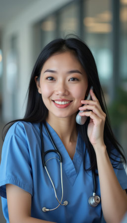A cheerful young Asian nurse in scrubs is smiling while talking on the phone, radiating warmth and professionalism. Her confident demeanor and caring expression highlight the essential role of healthcare workers in providing support and communication.
