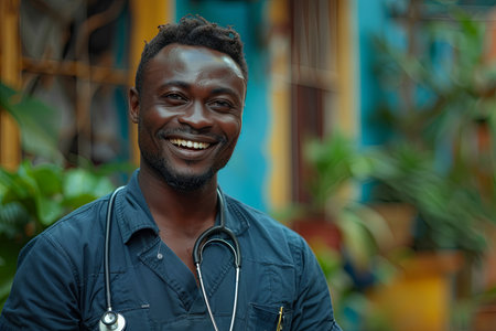 Professional black doctor standing confidently in modern hallway with glowing, warm light ambiance.
