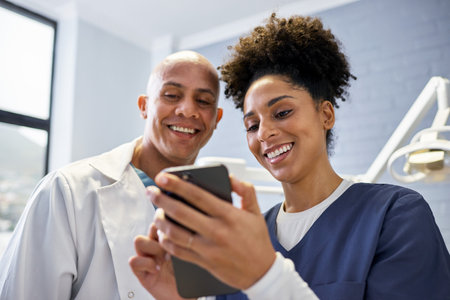 Dentist and Dental Nurse Reviewing Information on a Smartphone in a Modern Clinic