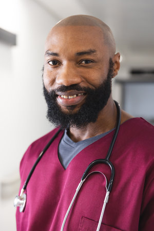 Portrait of happy african american male doctor wearing red scrubs in corridor at hospital. Hospital, work, medicine and healthcare, unaltered.
