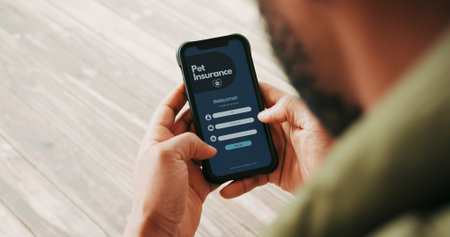Phone screen, hands or person with app for pet insurance, account creation or login for registration. Mobile, display and man sign up for service in home, veterinary coverage or health policy