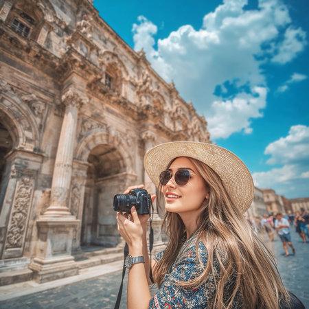 Smiling woman with a camera sightseeing near historic architecture on a sunny day