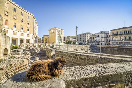 Ancient amphitheater and cute cat in city center of Lecce, Puglia, Italy