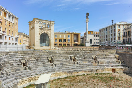 The iconic Roman amphitheatre in Sant'Oronzo square, one of the most visited spots in Lecce on Puglia, Italy