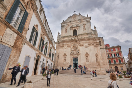 Martina Franca Apulia Italy November 2019: Tourists And Locals Gather Around Basilica of San Martino in Piazza Plebiscito, province of Taranto, Apulia in southern Italy