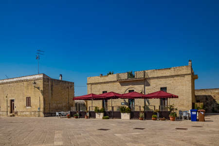 The small fortified village of Acaya, Lecce, Salento, Puglia, Italy. The large stone-paved square. The ancient medieval castle with towers and moat.