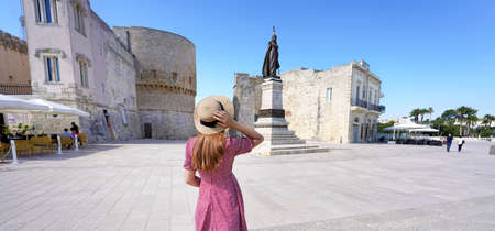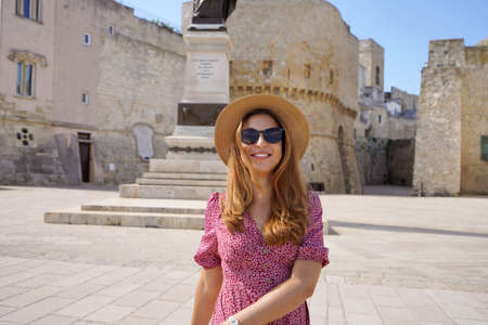 Relaxed tourist girl strolling in the old town of Otranto, Apulia, Italy