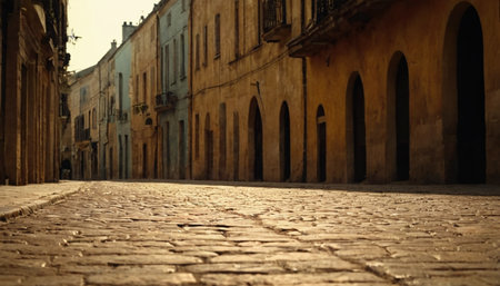 A low-angle view of a cobblestone street with old buildings and arched doorways illuminated by warm sunlight.