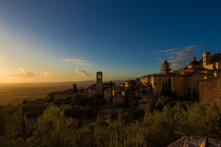 Assisi historic center ancient buildings and Umbria countryside at sunset