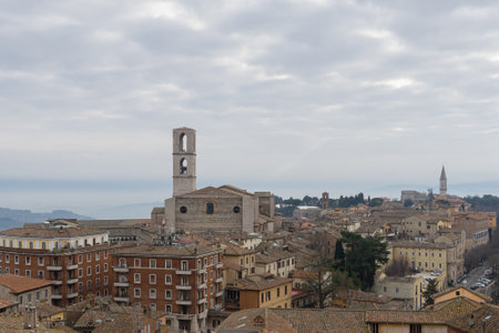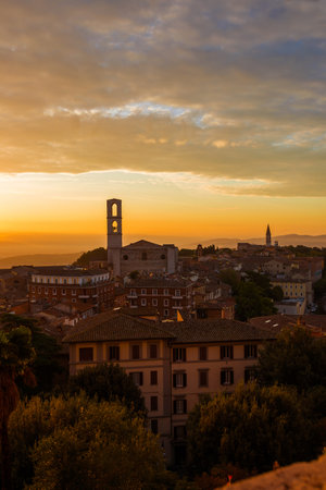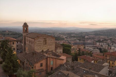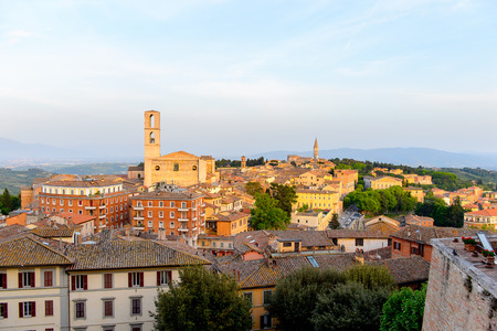 Perugia ancient skyline at sunset with St Peter iconic bell tower