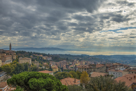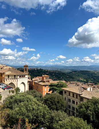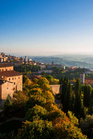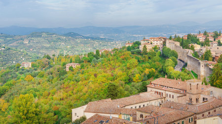 View of Perugia medieval historic center and Umbria countryside from city panoramic terrace