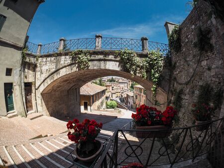 Arc and stone staircase in the street of Spoleto town. Italy.