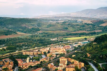 Todi in Umbria, Italy. Panorama from the medieval city of the Church of the SS. Crocifisso and of the valley of the Tiber river, which flows towards Orvieto and Rome.