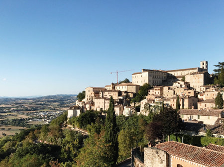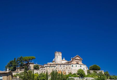 View of the ancient city of Amelia, in Umbria. The boundary wall, the houses and the cathedral with the dodecagonal tower on the top of the hill. The dome, the bell tower. Clear blue sky in the summer