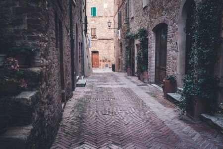 Narrow old streets of Montepulciano town, located on top of a limestone ridge surrounded by vineyards. Vino Nobile wine territory, known worldwide for its wine and food tours. Tuscany, Italy.