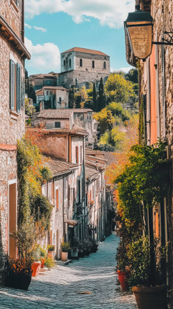 A narrow cobblestone street winds through a quaint Italian village, lined with rustic stone buildings and vibrant greenery, leading to a medieval tower under a clear blue sky.