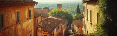 View of Umbria contryside from Perugia historic center roofs with old belfry