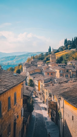 A picturesque hillside village in Tuscany showcases narrow streets lined with charming homes, terracotta roofs, and rolling green hills under a bright blue sky, inviting exploration.