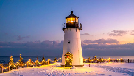 A white lighthouse with a Christmas wreath and festive lights stands in a snowy landscape at dusk.