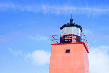 The Charlevoix Lighthouse. The tower and catwalk of the historical Charlevoix Lighthouse set against a blue sky background in beautiful Charlevoix, Michigan.