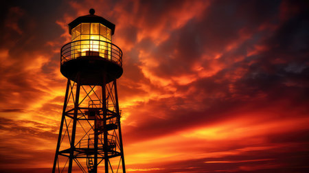 This stunning image captures a bright lighthouse at sunset, casting light over calm waters beneath a vibrant sky. Ideal for themes of tranquility and navigation.