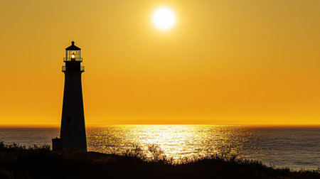 A stunning lighthouse is silhouetted against a warm sunset with shimmering ocean waters, creating a tranquil seaside atmosphere perfect for relaxation and inspiration.