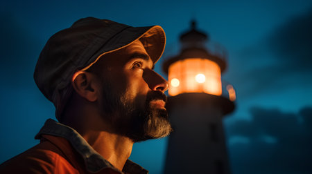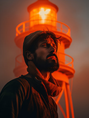 Portrait of a man in a hat and a scarf against a lighthouse.