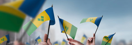Saint Vincent flags in their hands on a blurred urban background