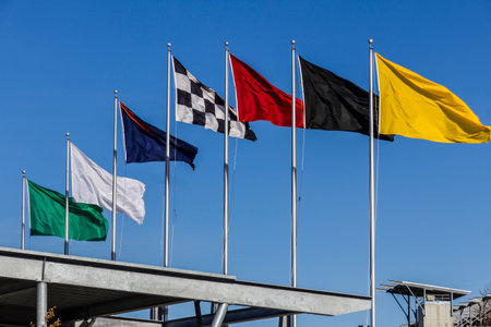 Indianapolis - Circa February 2017: The seven racing flags at Indianapolis Motor Speedway. IMS Prepares for the 101st Running of the Indy 500 IV
