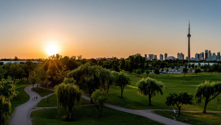 Modern towers may be seen in the backdrop as a green city park is illuminated by sunset.